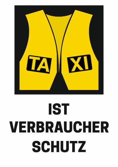 Aufkleber, schwarz mit ausgestanztem Wort "TAXI". Erhältlich als PDF in druckfähiger Größe von 300dpi. Kann vorn oder hinten auf gelber Weste angebracht und getragen werden.
